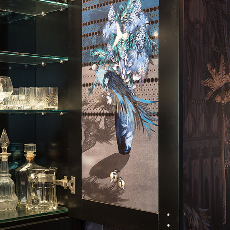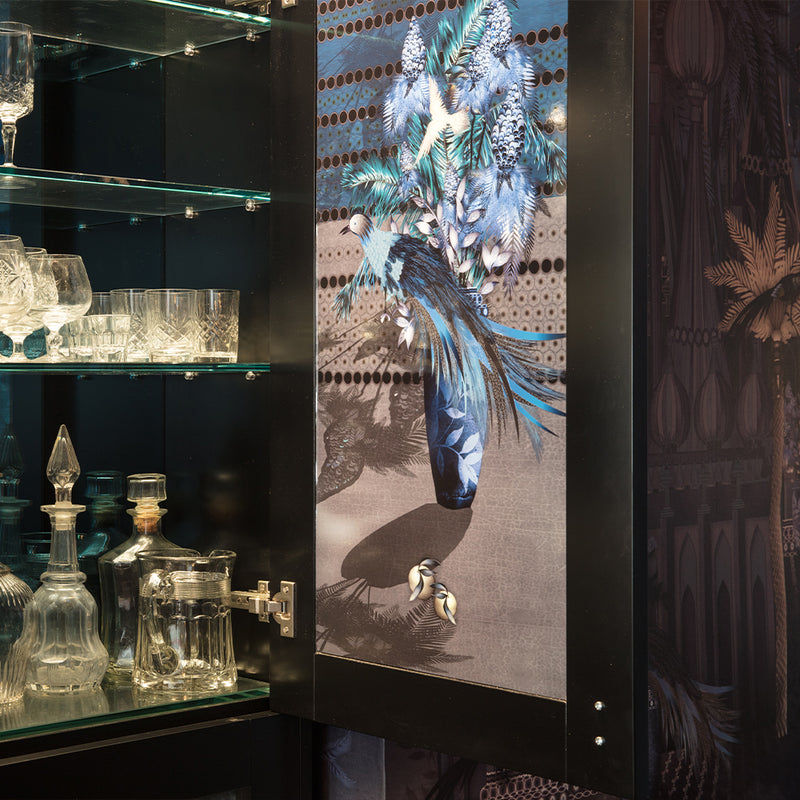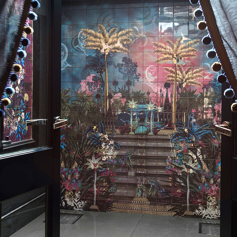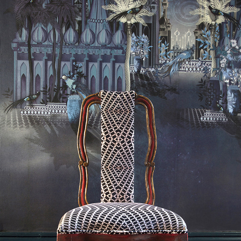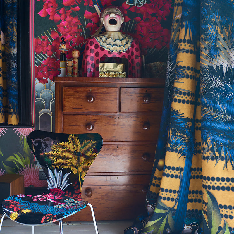The result was a stunning wallpaper that transitions from day to night, flowing effortlessly into curtains, cabinet interiors, chairs, cushions, and an outdoor tiled wall.
