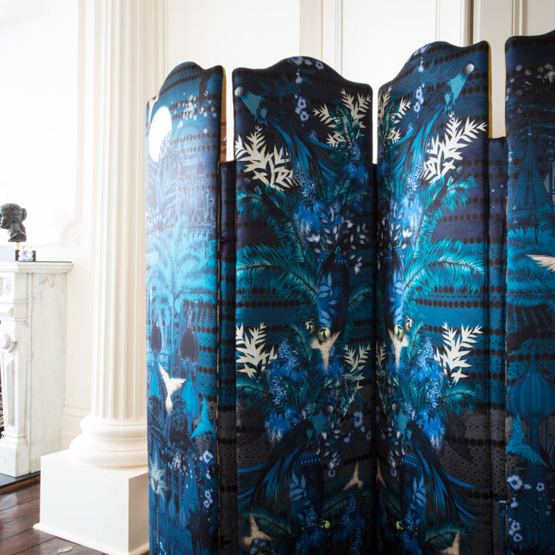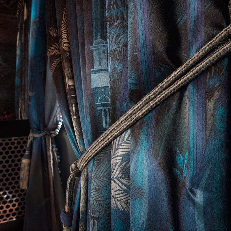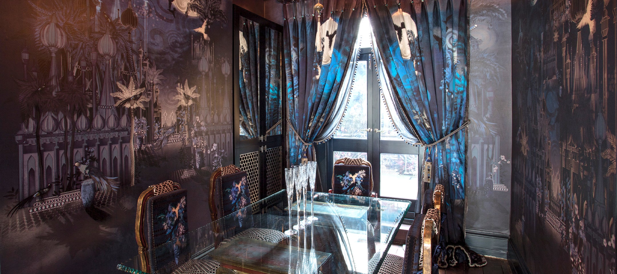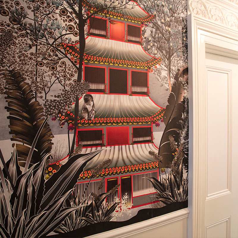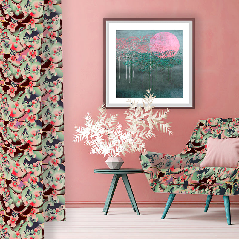 The result was a stunning wallpaper that transitions from day to night, flowing effortlessly into curtains, cabinet interiors, chairs, cushions, and an outdoor tiled wall.